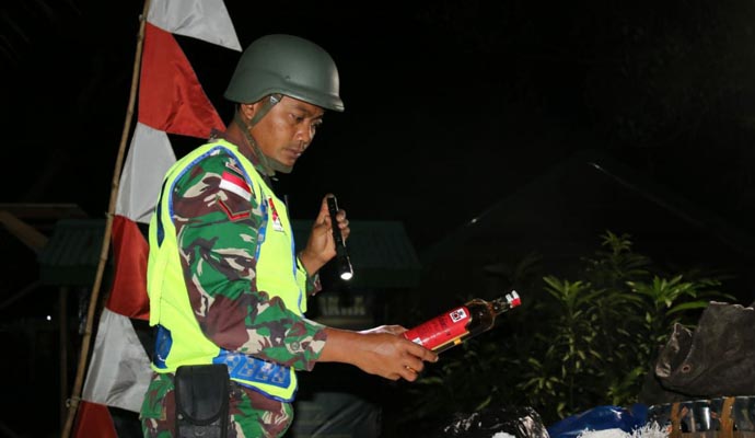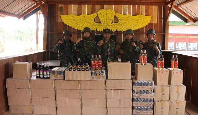 Prajurit TNI Batalyon Infanteri Mekanis Raider (Yonif MR) 411/Pandawa Kostrad yang tergabung dalam Satuan Tugas Pengamanan Perbatasan (Satgas Pamtas) Republik Indonesia-Papua Nugini (RI-PNG), berhasil mengamankan 3.333 botol Miras ilegal saat menggelar sweeping di Jalan Poros Trans Papua perbatasan RI-PNG, tepatnya di Kalimaro, Distrik Elikobel, Kab. Merauke, pada Senin malam (12/8/2019).