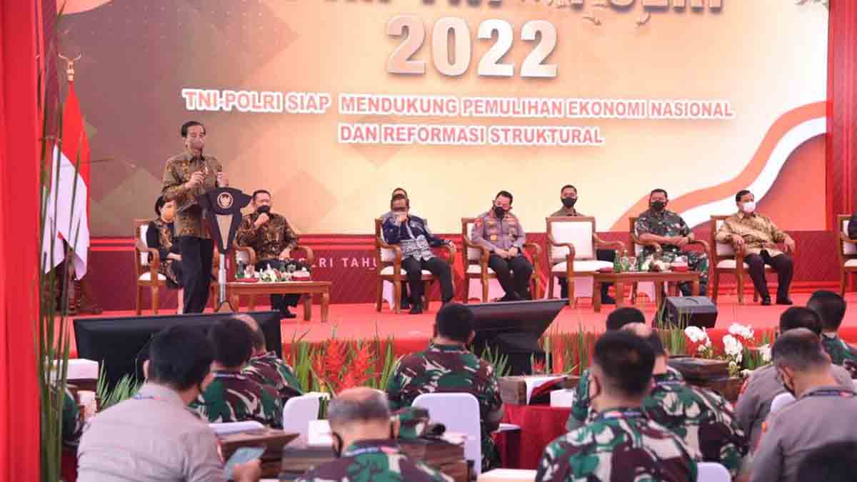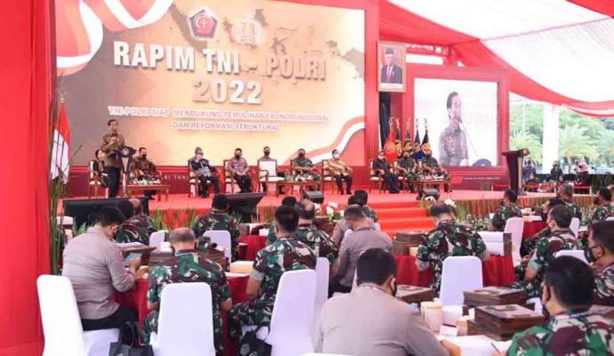 Demikian yang dikatakan Presiden RI Joko Widodo, dalam pembukaan Rapim TNI Polri 2022 yang mengambil tema “TNI Polri Siap Mendukung Pemukihan Ekonomi Nasional dan Reformasi Struktural” dilapangan Plaza Mabes TNI, Cilangkap, Jakarta Timur, Selasa (1/3/2022).