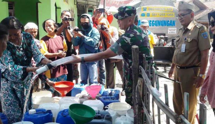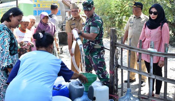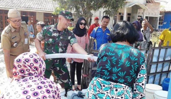 Respon TNI dalam membantu kesulitan masyarakat atasi kekeringan berkepanjangan, kembali didistribusikannya 35 ribu liter air bersih kepada warga masyarakat di lokasi TMMD Reguler 105 Kodim 0712 Tegal, Desa Jatimulya, Kecamatan Suradadi, Kabupaten Tegal, Jawa Tengah. Senin (22/7/2019).