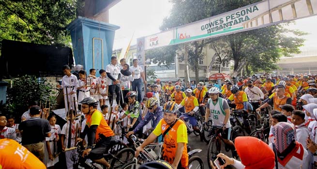 InilahOnline.com (Kota Bogor) – 120 siswa Sekolah Dasar (SD) memainkan musik angklung dengan lagu Indonesia Pusaka sebagai awal pembuka acara Gowes Pesona Nusantara (GPN) 2017 di Gor Pajajaran, Jalan Pemuda, Kota Bogor, Minggu (3/9/2017).