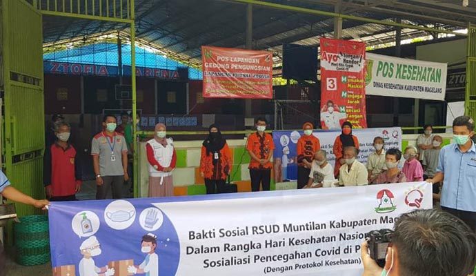 Dalam memperingati Hari Kesehatan Nasional ke 56, RSUD Muntilan, Kabupaten Magelang, melakukan bakti sosial dan sosialisasi Pencegahan covid kepada warga terdampak erupsi Gunung Merapi, di lokasi pengungsian dengan protokol kesehatan 3 M, yakni memakai masker, mencuci tangan pakai sabun dan menjaga jarak.