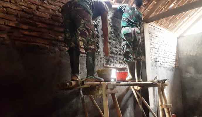 Tampak para teknisi bangunan Kodim Brebes sedang memplester dinding rumah milik Misman, warga Ganggawang RT. 07 RW. 02. Rabu (8/9/2021).