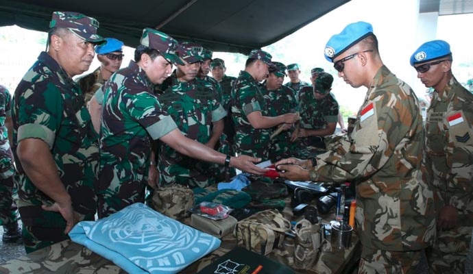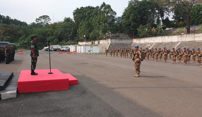 Asisten Operasi (Asops) Panglima TNI Mayjen TNI Ganip Warsito, S.E., M.M., diwakili oleh Paban 4/Ops Sops TNI Kolonel Inf Suhardi melaksanakan pengecekan Gelar Kesiapan Personel dan Perlengkapan Satuan Tugas (Satgas) Kompi Zeni (Kizi) TNI Kontingen Garuda (Konga) XXXVII F United Nations MULTI-Dimensional Intergrated Stabilization Mission in Central in Africa (Minusca) TA 2019 bertempat di lapangan upacara PSOPP PMPP TNI, Sentul, Bogor, Jumat (13/9/2019).