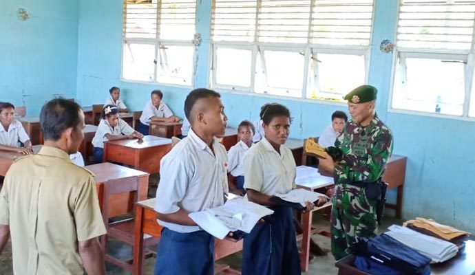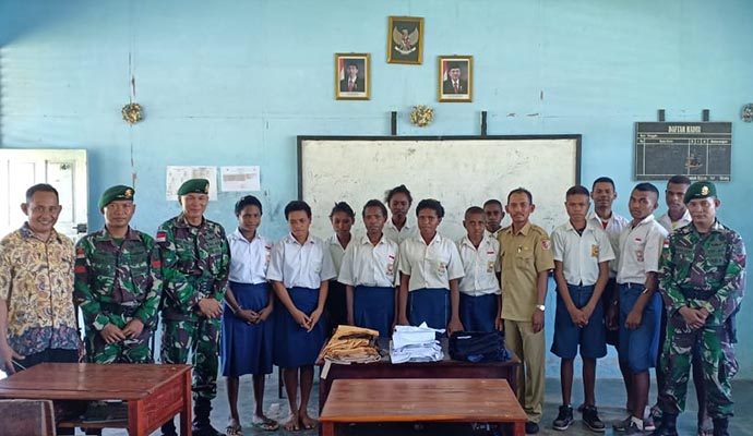 Melalui program “Pandawa Peduli” Satgas Pamtas RI-PNG Yonif MR 411/Pdw Kostrad menggelar kegiatan bhakti sosial dengan membagikan seragam sekolah kepada pelajar di SMP Negeri Erambu, Distrik Sota, Kabupaten Merauke, Provinsi Papua, Kamis (13/2/2020).