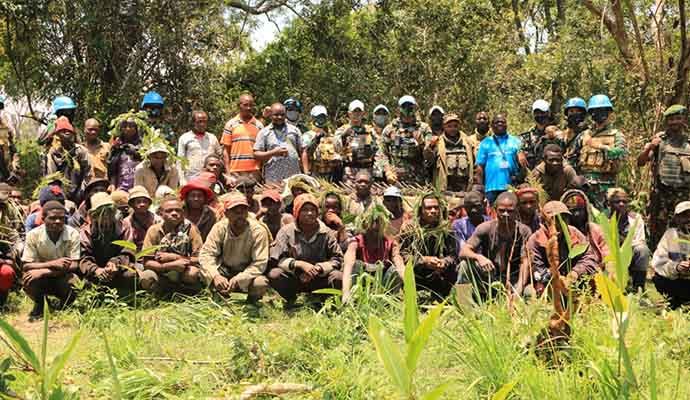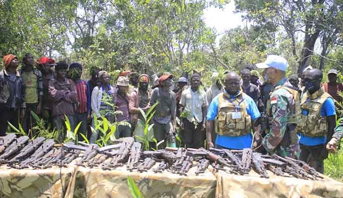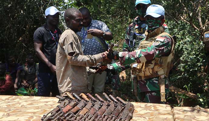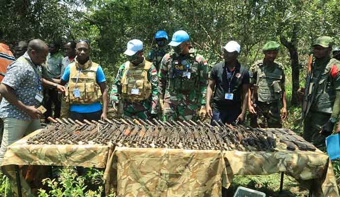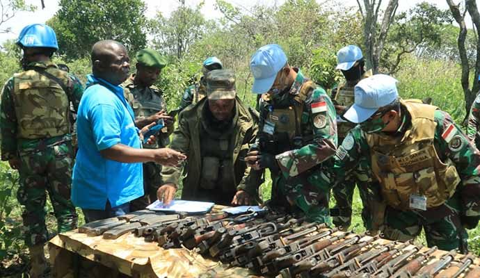 Satuan Tugas (Satgas) Kontingen Garuda (Konga) XXXIX-B Rapid Deployable Battalion (RDB) Mission de lOrganisation des Nations Unies pour La Stabilisation en République Démocratique du Congo (MONUSCO) kembali mengukir prestasi di tanah Afrika dengan menurunkan 32 pucuk senjata jenis AK-47 beserta 43 orang milisi bersenjata secara sukarela melalui pendekatan persuasif dan dialog dengan para pemangku adat di desa Nsela hingga Mapanda, Afrika, Senin (5/10/2020).