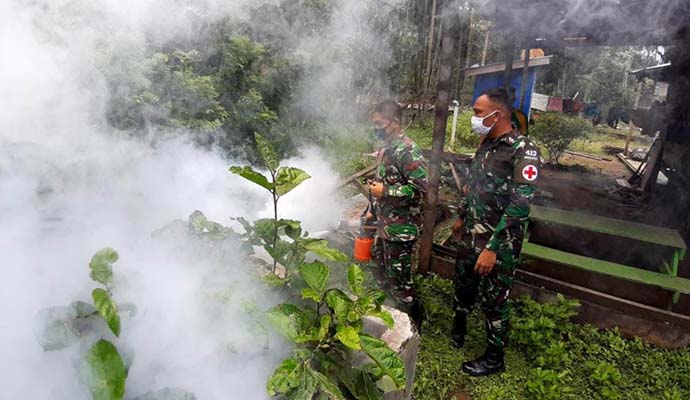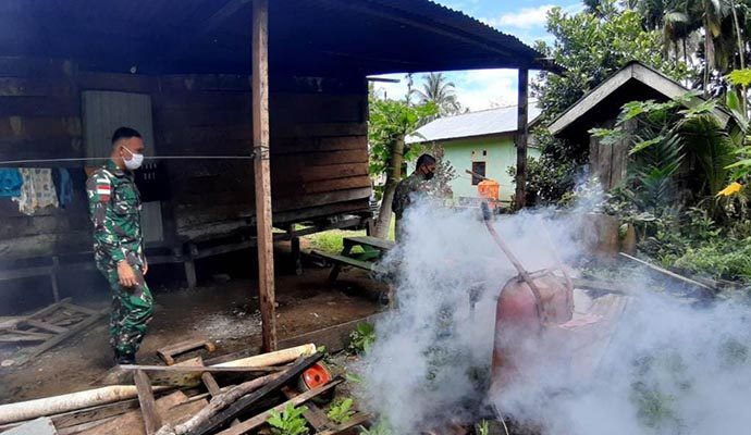 Satgas Pamtas RI-PNG Yonif Mekanis Raider 413 Kostrad Pos Kaliasin melakukan kegiatan pencegahan penyakit Malaria dengan menggelar pengasapan (Fogging) dan Pengecekan Rapid Diagnistic Test (RDT) pada Warga Kampung Kibay, Distrik Arso Timur, Kabupaten Keerom.