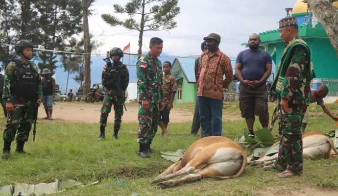 Usai melaksanakan Shalat Idul Adha, personel Pos Kotis Satgas Pamrahwan Yonif RK 751/VJS membantu masyarakat Distrik Walesi melaksanakan penyembelihan hewan qurban sebanyak 5 ekor sapi di halaman Masjid Al-Aqsho, yang dihadiri pula oleh Tokoh Masyarakat Suku Walesi H. Abu Hanifa Asso.
