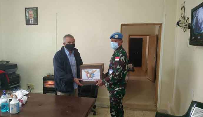 Satuan Tugas Batalyon Mekanis XXIII-O UNIFIL yang dipimpin Perwira Civil-Military Coordination (CIMIC) Mayor Inf Eko Sugiarto memberikan donasi berupa handsanitizer, masker, obat-obatan dan kalender kepada masyarakat desa binaan di wilayah Tulin yang merupakan AoR (Area of Responsibility) Indobatt, Lebanon Selatan, Jumat (19/3/2021).