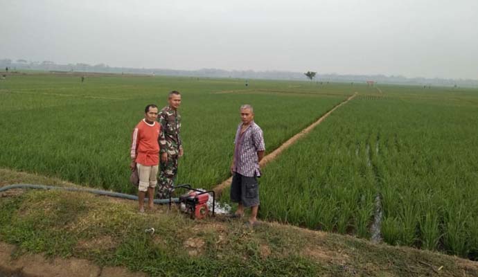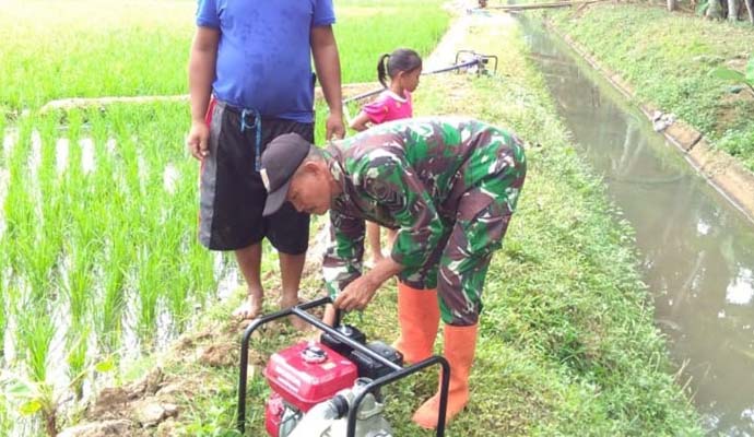 Babinsa Cilempuyang Koramil 14 Cimanggu Kodim 0703/Cilacap, Sertu Carnoyo melaksanakan Komunikasi Sosial (Komsos), dengan warga binaannya. Komsos tersebut, dilakukannya dengan membantu mengairi lahan persawahan para petani di Desa Cilempuyang, Kecamatan Cimanggu Timur, Kamis (04/07/2019).