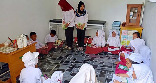1. Arina Amaliah (berdiri kiri) memberikan pengarahan program PHBS kepada siswa SDN 204 Napal Putih Tebo.