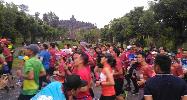 Tepat pukul 05.00 Minggu dinihari Gubernur Jawa Tengah Ganjar Pranowo memberikan aba aba di titik start bagi peserta lomba borobudur marathon jaraka 42,195 kilometer. Selang 30 menit kemudian diikut half marathon 21,1 kilometer dan 10 kilometer.