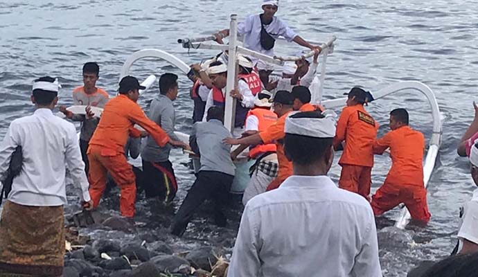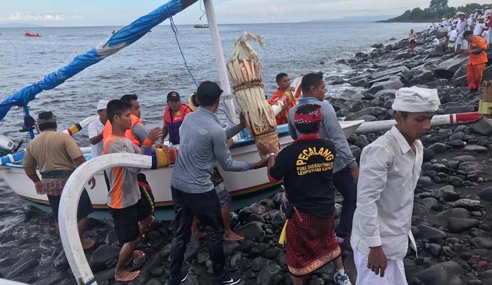 Personil Bakamla Stasiun Pemantauan Keamanan dan Keselamatan Laut (SPKKL) Bali ikut serta dalam pengamanan gabungan terhadap prosesi Pekelem/Melarung di tengah Laut, di wilayah Pantai Ujung, Desa Ujung Hyang, Kec. Karangasem, Kab. Karangasem, Bali, kemarin.