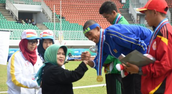 Cibinong – Bupati Bogor, Hj. Nurhayanti berkesempatan mengalungkan medali emas kepada pelari Nasional asal Jawa