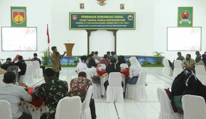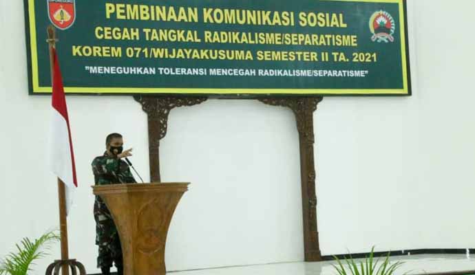 Hal tersebut diungkapkan Danrem/071 Wijayakusuma, Kolonel Inf Dwi Lagan Safudrin, S.I.P., dalam sambutannya yang di bacakan oleh Kasiter Rem 071/Wk Letkol Inf Eddy Lallo pada acara Pembinaan Komunikasi Sosial Cegah Tangkal Radikalisme dan Separatisme di Makorem 071/Wijayakusuma, Kamis (30/9/2021).