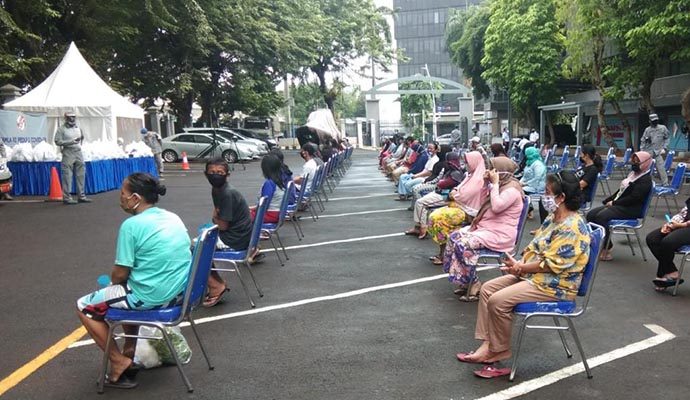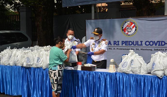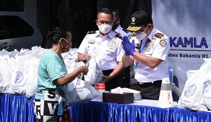 Badan Keamanan Laut (Bakamla) RI kembali menggelar bakti sosial Peduli Covid-19 dengan melakukan pemberian sembako kepada warga sekitar kantor Bakamla RI, khususnya para pekerja harian, ojek online, tukang parkir, warga prasejahtera, serta warga lainnya yang terdampak pandemi Covid-19.