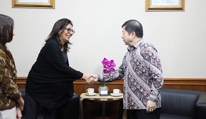 Menteri Perencanaan Pembangunan Nasional (PPN)/Kepala Bappenas Suharso Monoarfa menerima kunjungan perwakilan khusus Sekretaris Jenderal PBB bidang perlindungan anak Dr. Najat Maalla M’jid di Kantor Kementerian PPN/Bapennas, Jakarta Pusat, pada hari Senin (02/03/2020) pagi hari.