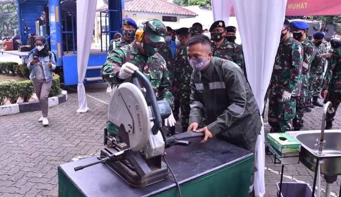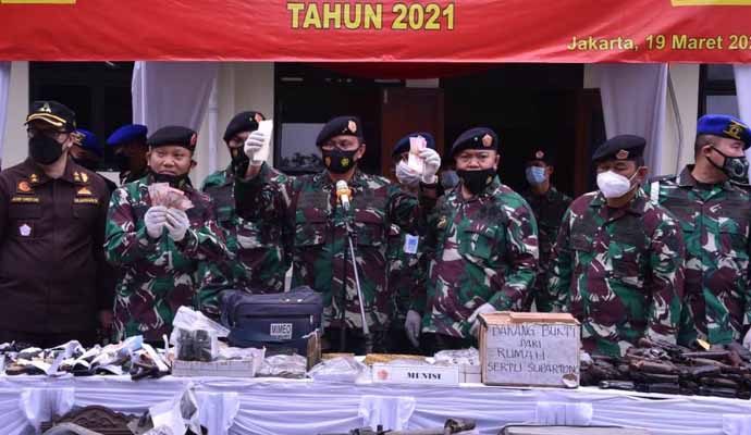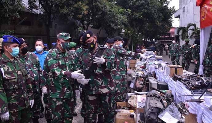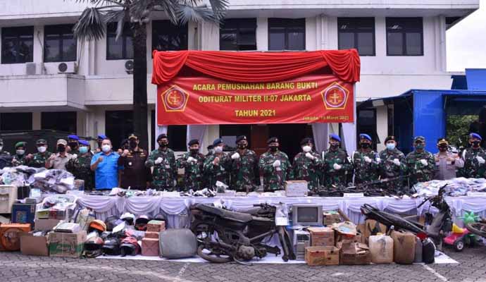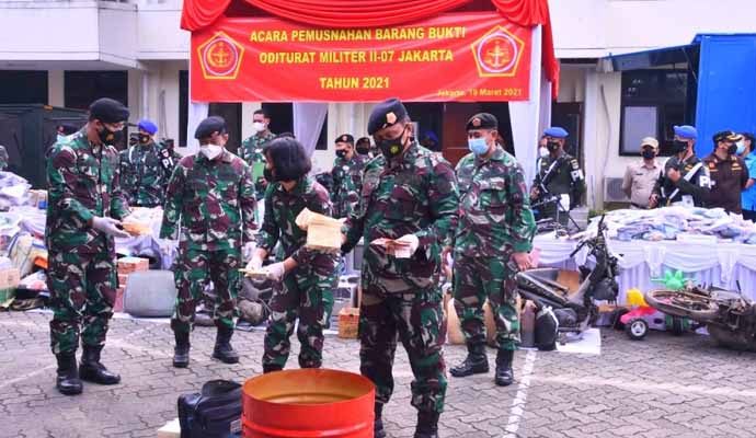 Tentara Nasional Indonesia (TNI) melaksanakan pemusnahan berbagai jenis barang bukti perkara tindak pidana militer dengan tetap menjalankan protokol kesehatan Covid-19, bertempat di halaman kantor Oditur Militer II-07 Jakarta, Jl. Dr. Soemarmo Pulogebang, Jaktim, Jumat (19/3/2021).