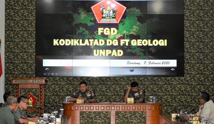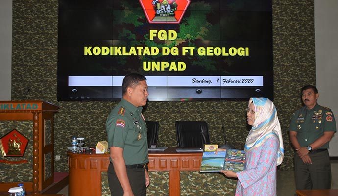 Universitas Padjajaran (Unpad) menggelar Focus Group Discussion (FGD) dengan Kodiklat Angkatan Darat (Kodiklatad) sebagai kelanjutan dari perencanaan pengembangan sumber daya manusia TNI AD. Dankodiklatad, Letjen TNI AM. Putranto S.Sos menerima secara langsung rombongan delegasi dari Fakultas Teknik Geologi (FTG) Unpad yang dipimpin oleh Wakil Dekan, Dr. Sc. Yoga Adriana Sendjaja, ST, M.Sc di ruangan Ganesha, Makodiklatad, Jumat (7/2/2020).