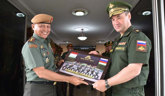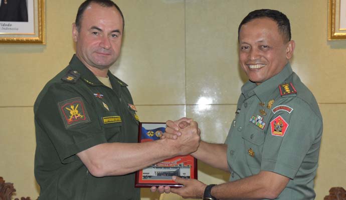 Wadan Pussenarmed Kodiklatad Kolonel Arm Khoirul Hadi, S.E., didampingi Dirbinum Pussenarmed Kolonel Arm Hendro Agus Suseno S.I.P., menerima kunjungan delegasi Combined Arms Academy Angkatan Bersenjata Rusia, pertemuan ini berlangsung di Mako Pussenarmed Jalan Baros No.6 Cimahi, Senin (26/6). Kunjungan ini bertujuan untuk lebih meningkatkan hubungan bilateral Indonesia dengan Rusia, khususnya di bidang militer.