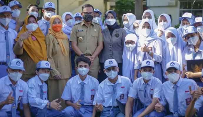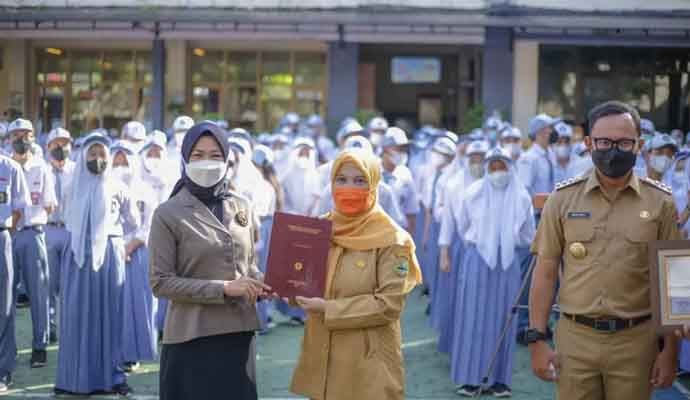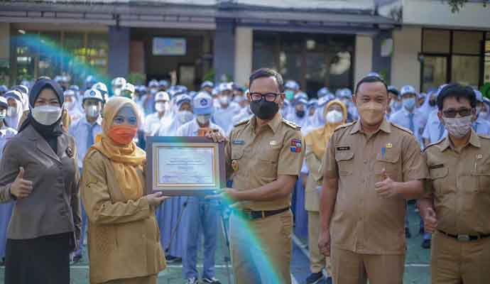 Penghargaan dari Menteri Lingkungan Hidup dan Kehutanan (LHK) dan Menteri Pendidikan, Kebudayaan, Riset dan Teknologi (Mendikbudristek) diserahkan secara simbolis Wali Kota Bogor, Bima Arya didampingi istrinya Yane Ardian di SMAN 4 Kota Bogor, Senin (24/1/2022).