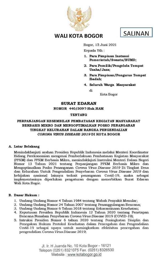 INILAHONLINE.COM, BOGOR — Wali Kota Bogor Bima Arya resmi mengeluarkan Surat Edaran dengan Nomor 440/3097-Huk.HAM tentang Perpanjangan Kesembilan Pembatasan Kegiatan Masyarakat Berbasis Mikro dan Mengoptimalkan Posko Penanganan Tingkat Kelurahan Dalam Rangka Pengendalian Corona Virus Disease 2019 di Kota Bogor.