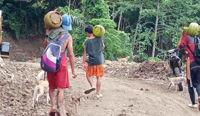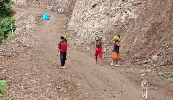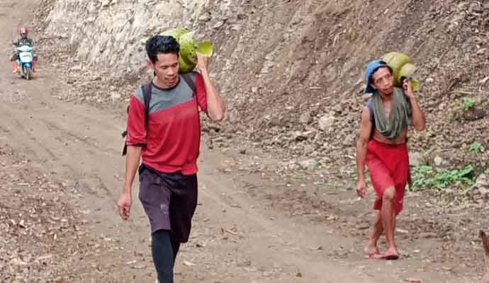 Warga memikul beras dan bahan-bahan lainnya, sambil berjalan kaki di jalan yang licin terguyur hujan ringan hingga ke kampung Tola.